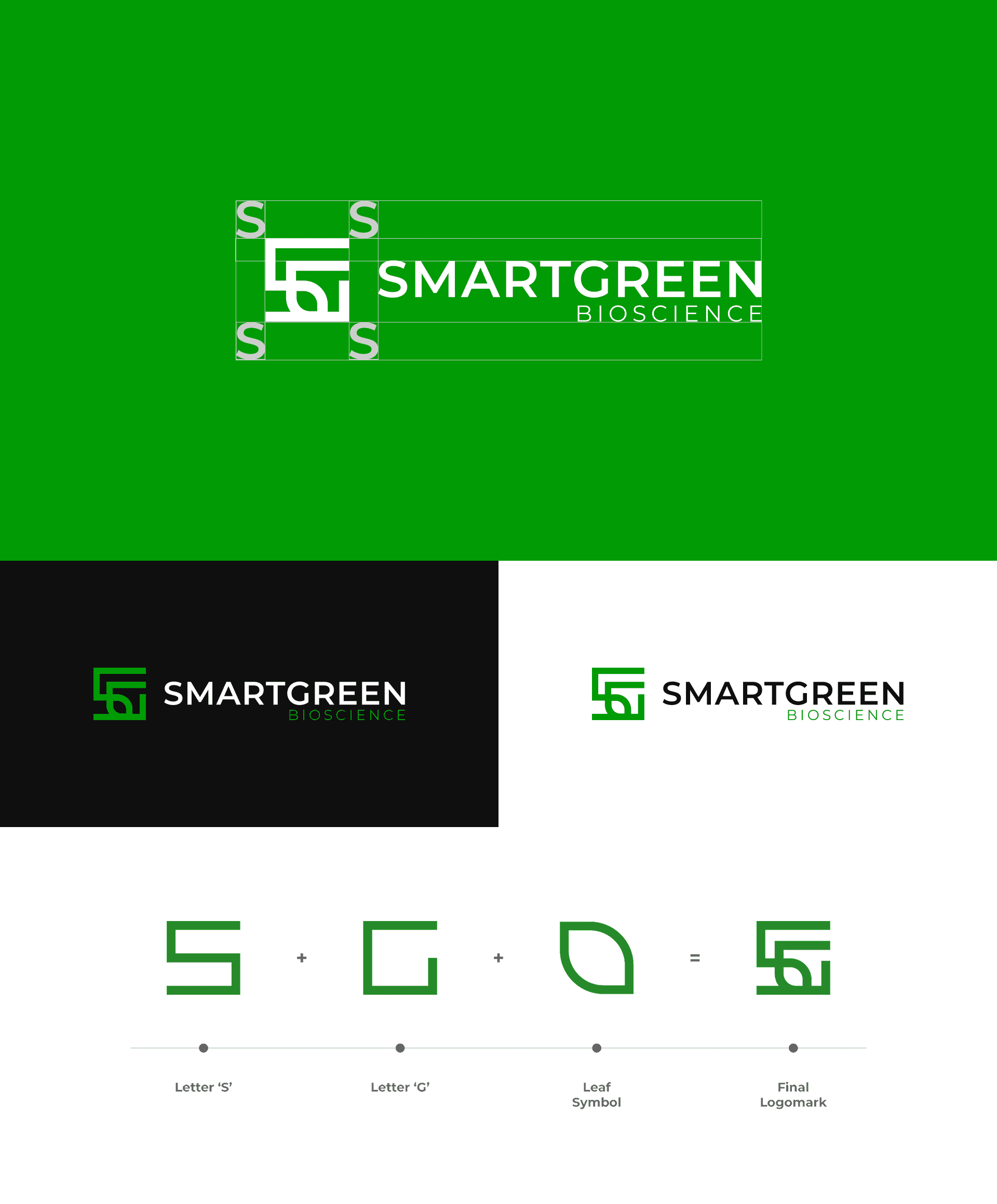 For the SmartGreen Bioscience logo, the concept combines the letters “S” and “G”—the brand’s initials—into a single, cohesive form. Within this design, a leaf icon is integrated to immediately convey the brand’s connection to nature and organic products.