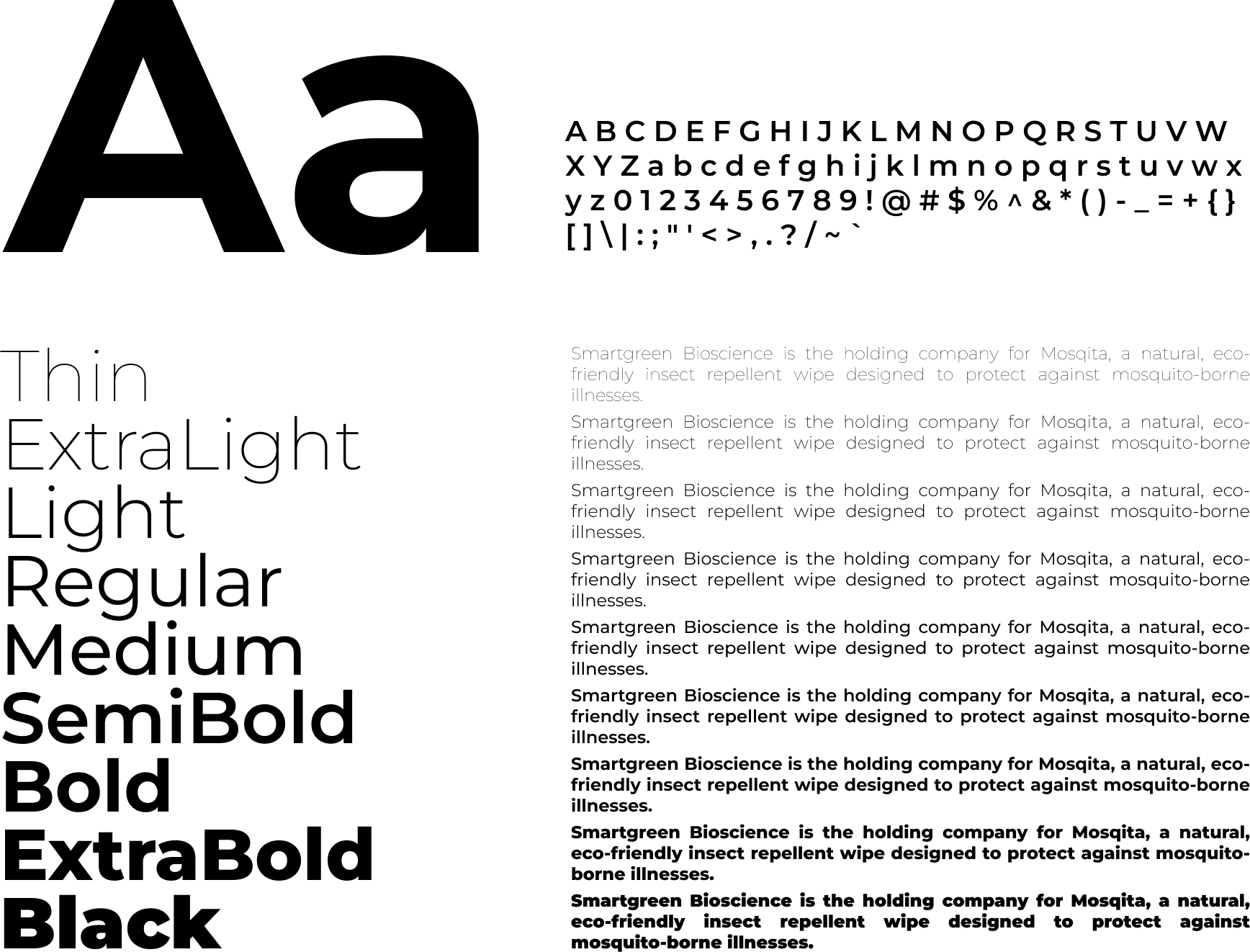 Montserrat has been selected as the primary typeface for SmartGreen Bioscience because it balances modernity, professionalism, and versatility. Its geometric sans-serif design gives the brand a clean and contemporary appearance that aligns with innovation in bioscience while maintaining a sense of clarity and precision. At the same time, Montserrat avoids overly trendy characteristics, allowing it to remain timeless and relevant for years to come.