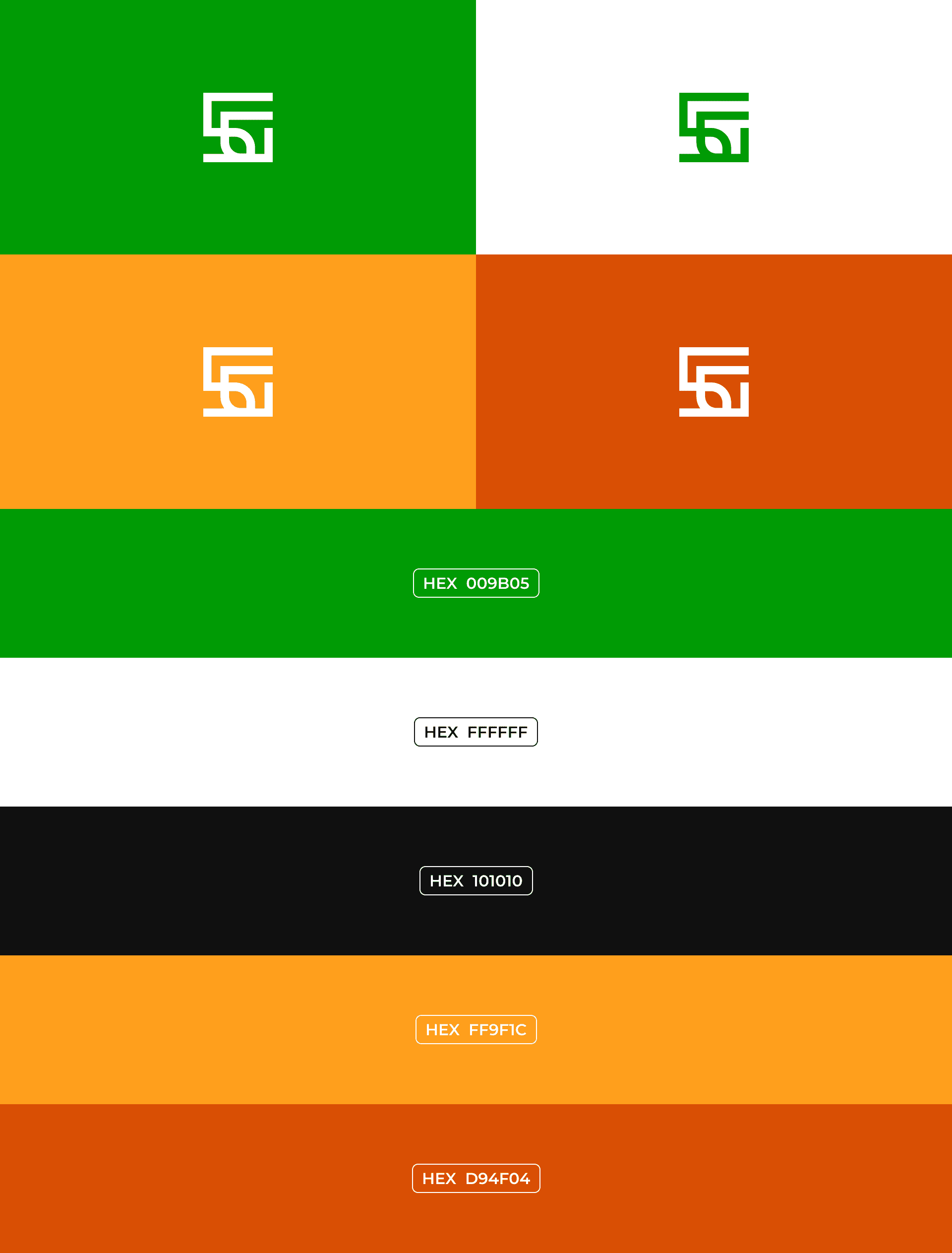 To complement the primary Forest Green (#009B05), two warm earth tones—Sunset Amber (#FF9F1C) and Rustic Copper (#D94F04)—are introduced to add visual contrast while maintaining the brand’s natural and organic character.